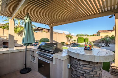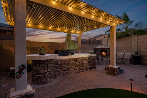 Welcome to your ultimate entertainment oasis nestled within the coveted gated Fairways neighborhood! This remarkable basement home, perfect for multi-family living, presents 5 bedrooms, 3.5 bathrooms, and an inviting pool! Lot's to love including brand new AC's! The chef's kitchen is a culinary delight, boasting granite countertops, a built-in refrigerator, gas cooktop, convection oven, and exquisite cherry cabinets equipped with convenient pull-outs. Enhanced tile flooring graces all high-traffic zones. Unwind in the open family room featuring a cozy gas fireplace. Your dreamy Master Retreat beckons with patio access, a spacious walk-in closet, a luxurious walk-in snail shower, dual vanities, and a relaxing soaker tub. Venture downstairs in the basement to ample additional living space, complemented by a wet bar. Outside, revel in your private backyard oasis complete with a shimmering pool, an outdoor fireplace, and a charming gazebo housing a built-in BBQ - perfect for entertaining! Additionally, relish the convenience of a three-car garage featuring built-in storage cabinets and epoxy floors. Embrace the amenities of the Master Planned Community of Estrella, including a public Troon golf course, two community pools, two fitness facilities, serene lakes, picturesque parks, enticing restaurants, a grocery store, and much more! Experience luxury living at its finest!