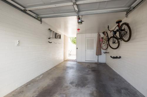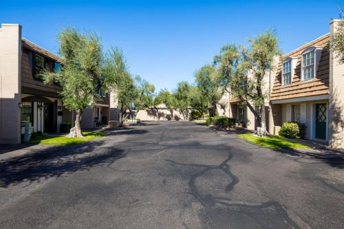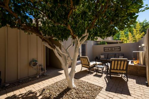 Perfectly positioned in the highly walkable Camelback Corridor, this stunning and stylish 2-bedroom, 1.5-bath home combines modern updates with effortless charm. Quiet cul-de-sac spot in Regency Circle with welcoming front paver-stone patio entry. Updated kitchen shines with white Shaker-style cabinetry, newer stainless appliances and glass front cabinets with soft-close drawers. The open layout with neutral flooring flows to a sunny private patio featuring gas fire feature and sweet orange tree. A rare private oversized garage with extra storage room! Total enjoyment of your unit with no shared walls with neighbors. Upstairs both bedrooms are light filled and larger west bedroom features mini-split system with bedside remote and app for concentrated, efficient cooling. Full bath features updated walk-in tiled shower, while a downstairs powder room and large indoor laundry space adds everyday ease. Featuring dual-pane low-e windows, new window blinds and a newer roof (2023 recoat of 2013-installed new foam), this move-in-ready home offers both style and peace of mind. Lap-length community pool just steps away, serving the 17-home boutique community. Just minutes from Uptown Plaza, Luci's, and favorite neighborhood dining - experience the best of Camelback Corridor living in this beautifully maintained retreat.
