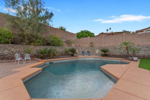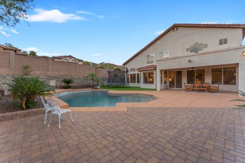 Stunning home nestled in the Ahwatukee Foothills surrounded by beautiful mountain views and steps away from the Desert Foothills Community Park. This corner lot home features 5 bedrooms / 4.5 bathrooms (3 en-suite) / 3,580 sf / 9,135 sf lot. Fully owned solar with huge electricity savings & (2) newer A/C units. Step into luxury as you are greeted by sky high vaulted ceilings, a formal living & dining room, solid surface floors, plantation shutters & upgraded windows on the North & West sides of the home. The kitchen was fully remodeled in 2021 w/ the low soffits removed, shaker-style cabinets added (to the ceiling), custom crown moulding, large island w/ breakfast bar, granite countertops, glass cooktop w/ vented hood installed, wall microwave / oven, wine fridge & more. The eat-in dining room & open family room have beautiful views of the backyard. This space stays light & bright throughout the day with the many windows. One bedroom is located downstairs w/ an en-suite bathroom; perfect for guests or someone needing their own space. The den/office is also conveniently located downstairs w/ double doors & close to the entry. The spacious primary bedroom has high ceilings and is perfect for any furniture arrangement. The attached bathroom has a separate jetted tub / shower, privacy glass block for added natural light, walk-in closet & private toilet room. One additional guest bedroom upstairs has an en-suite bathroom as well. The backyard is your own private oasis w/ various hardscape surfaces, river-rock planter walls, caged river-rock adding an extra level of detail & newly installed artificial grass. The play-pool is ready for the hot summer w/ the large baja shelf, sheer water feature, elevated seating pad & a tall rear block wall for extra privacy. Top rated schools and easy freeway access make this home hard to pass up.