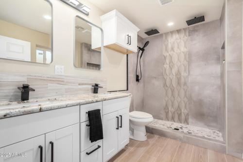 The primary bedroom features soft carpeting, sliding door access to the backyard, a walk-in closet, and a private bathroom with dual sinks. Spend enchanting evenings in the lovely backyard, which offers a spacious covered patio and abundant space for crafting your dream outdoor oasis. Don't miss out on this completely rebuilt gem!