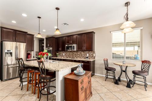 AMAZING 4 BEDROOM, 3 BATH HOME WITH HEATED PEBBLESHEEN POOL! Welcome to your dream home! This stunning property features 4 bedrooms plus a flex space upstairs that can serve as a 2nd loft, den, game room, or converted 5th bedroom. Enjoy low energy costs with leased solar panels—the average electric bill is only around $20/month! Inside, you'll find a bright, open-concept layout with: guest bedroom and full bath downstairs, new luxury vinyl plank flooring, gorgeous kitchen with granite countertops, tile backsplash, upgraded cabinets with crown molding, butler's pantry, high ceilings, upgraded staircase, upstairs laundry room, huge primary suite with two walk-in closets, water softener, R/O system, and extended length garage (26 feet!). Washer/Dryer/Refrigerator included! Step outside to your private backyard oasis featuring a heated, self-cleaning PebbleSheen pool, travertine deck, covered patio, and putting green for fun and relaxation. All this in a prime location near shopping, schools, and freeways! Must see!
