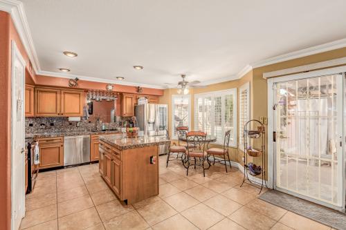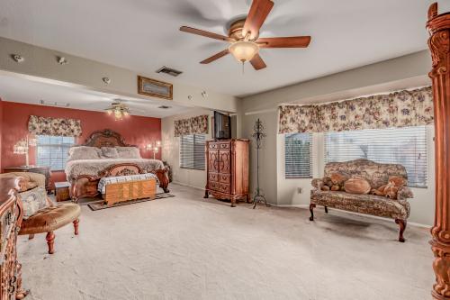 Spacious, rare property is walking distance to State Farm Stadium and perfect for entertaining! Permitted addition makes it the largest home in the neighborhood. No HOA! RV Gate & plenty of paved parking area. 2.5 baths and 4 bedrooms plus unexpected bonus room that could be a den, playroom, or office! Primary bedroom is HUGE with lots of extra room & tons of closet space. Eat-in-Kitchen is comfortable with a large island, plenty of storage, large pantry & newer appliances. Formal Dining room has decorative features that make the space truly one-of-a-kind. Backyard has everything you could wish for: huge shed for projects, built-in barbecue, extended covered patio, garden area & fenced pool area! Your guests will love the pool's large baja step, seating and colored lights & water feature.